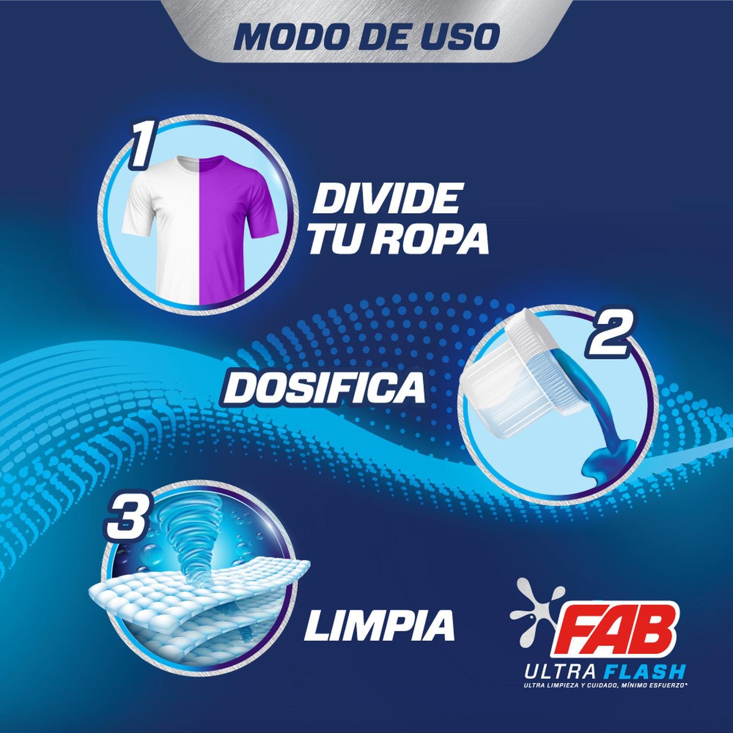 Nuevo Detergente en polvo FAB Ultra Flash, Ultra Limpieza y Cuidado, Minimo esfuerzo.* Cuenta con Bio-enzimas inteligentes que cuidan tu ropa y penetran profundamente las telas removiendo manchas dificiles como grasa y comida.** Ademas, cuenta con capsulas de perfume*** que dejan un aroma intenso y duradero en tu ropa. Es ideal para prendas blancas y de color. Remueve manchas dificiles aun sin remojar. Modo de uso: El lavado de tu ropa es muy simple para el lavado en lavadora seleccione el programa y siga las instrucciones recomendadas de su lavadora. Especificaciones de uso al reves del producto. Recomendaciones de Uso: Antes de empezar a lavar separe la ropa blanca y de color, verifique si la ropa suelta tinta con una prueba sencilla remoje una parte de la prenda en agua tibia, ponga un tejido blanco encima de la prenda y pase la plancha, si el tejido queda con el color de la prenda, es una señal que la ropa decolora y debe ser lavada por separado. Durante el lavado nunca ponga el polvo directamente sobre la ropa, disuelva el producto previamente.Los productos para el lavado de la ropa no deben ser mezclados con productos base de cloro. Lea atentamente las etiquetas de las prendas. Ingredientes: Tensoactivo, bicarbonato, enzimas, abrillantador optico, agente anti-redepositante, ayudas de proceso, fragancia, colorantes. Mantener en un lugar seco y fresco. Fabricado por Unilever Andina Colombiana LTDA. *vs fórmula anterior detergente Fab Lavado Perfecto para el lavado de la ropa en polvo **Remueve manchas difíciles como aceite de cocina, jugo de naranja y helado de chocolate en tela de algodón. Algunos ingredientes especiales en la composición de las manchas pueden afectar su remoción ***Aplica solo para portafolio Fab Ultra Flash Polvo.