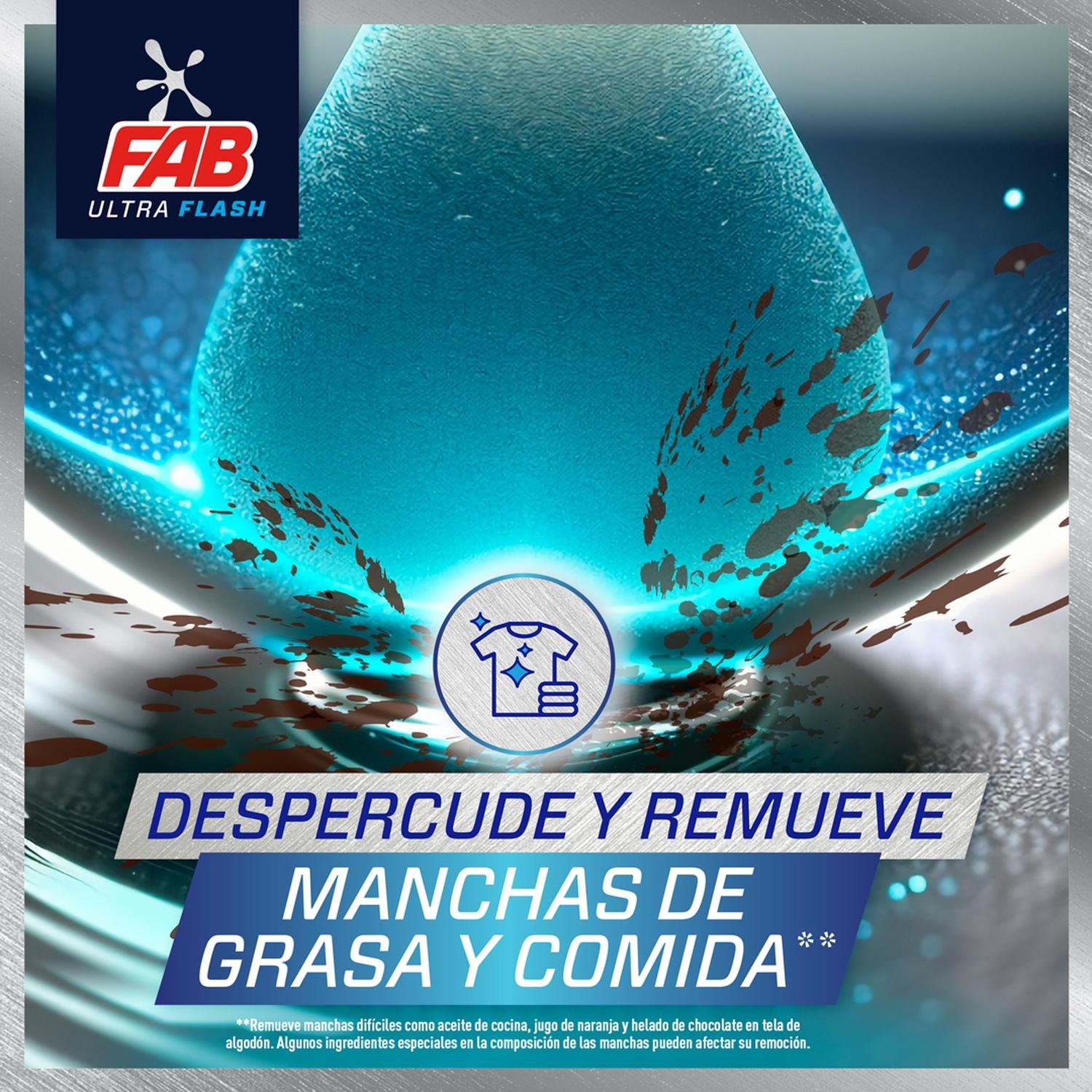 Nuevo Detergente liquido FAB Ultra Flash, Ultra Limpieza y Cuidado, Minimo esfuerzo.* Cuenta con Bio-enzimas inteligentes que cuidan tu ropa y penetran profundamente las telas removiendo manchas dificiles como grasa y comida.** Ademas, cuenta con perfume intenso y duradero que dejan un aroma intenso y duradero en tu ropa. Es ideal para prendas blancas y de color. Remueve manchas dificiles aun sin remojar. Modo de uso: El lavado de tu ropa es muy simple para el lavado en lavadora seleccione el programa y siga las instrucciones recomendadas de su lavadora. Especificaciones de uso al reves del producto. Recomendaciones de Uso: Antes de empezar a lavar separe la ropa blanca y de color, verifique si la ropa suelta tinta con una prueba sencilla remoje una parte de la prenda en agua tibia, ponga un tejido blanco encima de la prenda y pase la plancha, si el tejido queda con el color de la prenda, es una señal que la ropa decolora y debe ser lavada por separado. Durante el lavado nunca ponga el polvo directamente sobre la ropa, disuelva el producto previamente.Los productos para el lavado de la ropa no deben ser mezclados con productos base de cloro. Lea atentamente las etiquetas de las prendas. Ingredientes: Tensoactivo, bicarbonato, enzimas, abrillantador optico, agente anti-redepositante, ayudas de proceso, fragancia, colorantes. Mantener en un lugar seco y fresco. Fabricado por Unilever Andina Colombiana LTDA. *vs fórmula anterior detergente Fab Lavado Perfecto para el lavado de la ropa líquido **Remueve manchas difíciles como aceite de cocina, jugo de naranja y helado de chocolate en tela de algodón. Algunos ingredientes especiales en la composición de las manchas pueden afectar su remoción