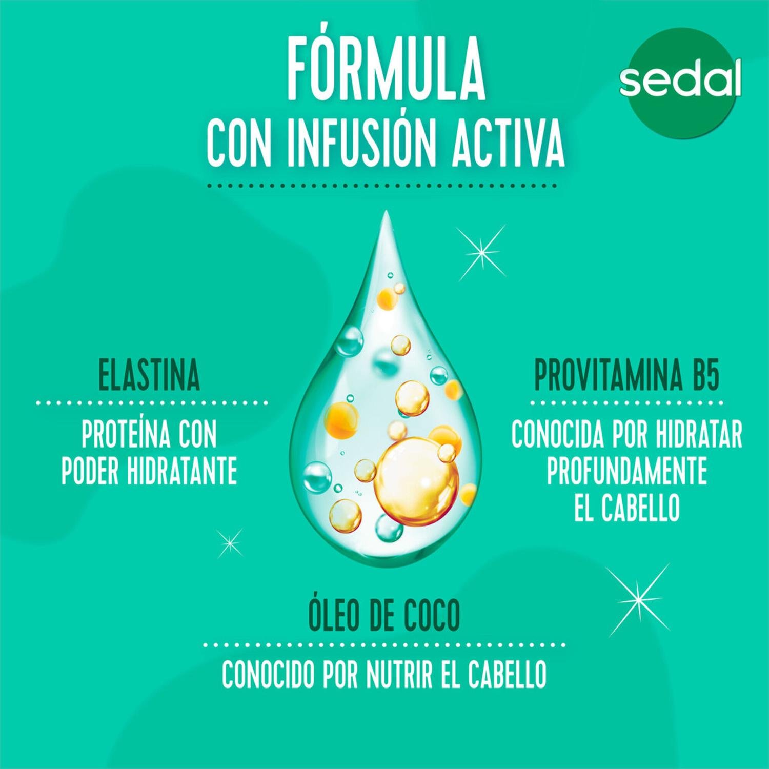 - 2: sedal rizos definidos con infusión activa, contiene oleo de coco, elastina y vitamina b5, que en conjunto con su fórmula ayudan a que tus rizos mantengan la fuerza, la hidratación y la forma definida, reduciendo el frizz para que sigas brillando*!