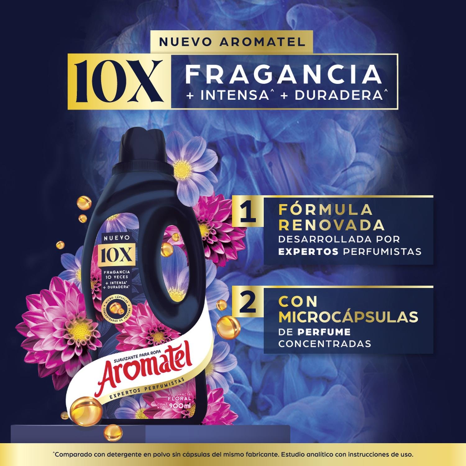 Descubre la deliciosa fragancia del nuevo Aromatel 10X Floral 2×2,5L. El nuevo Aromatel 10X con una fragancia 10 veces más intensa y 10 veces más duradera contiene microcápsulas de perfume concentradas las cuales se impregnan en tus prendas para que el aroma dure por mucho más tiempo. Además, su fórmula avanzada encapsula los malos olores, dejando tus prendas con un fresco aroma floral. El nuevo Aromatel 10X floral no solo se encarga de la fragancia de tus prendas, sino también de su cuidado. Está formulado para suavizar los tejidos, haciendo que tus prendas queden aún más suaves al tacto. Ideal para todo tipo de prendas, este suavizante se adapta a diferentes estilos de vida y necesidades, brindándote una experiencia sensorial única. Con Aromatel, tu ropa no solo quedará suave y fragante, sino que también estará libre de malos olores. Agita bien el envase antes de usar. Usa la tapa medidora para añadir Aromatel durante el ciclo de enjuague de tu lavadora. Deja que la lavadora complete su ciclo como de costumbre. Además, el Suavizante Aromatel Fragancia Floral Botella es muy práctico y económico gracias a su presentación doble de 2,5L, que te permite disfrutar de su exquisita fragancia por mucho más tiempo. Su formato en botella con tapa medidora facilita su uso, asegurando la cantidad correcta de producto para cada lavado. Experimenta la diferencia con Aromatel y da a tus prendas el cuidado que se merecen.