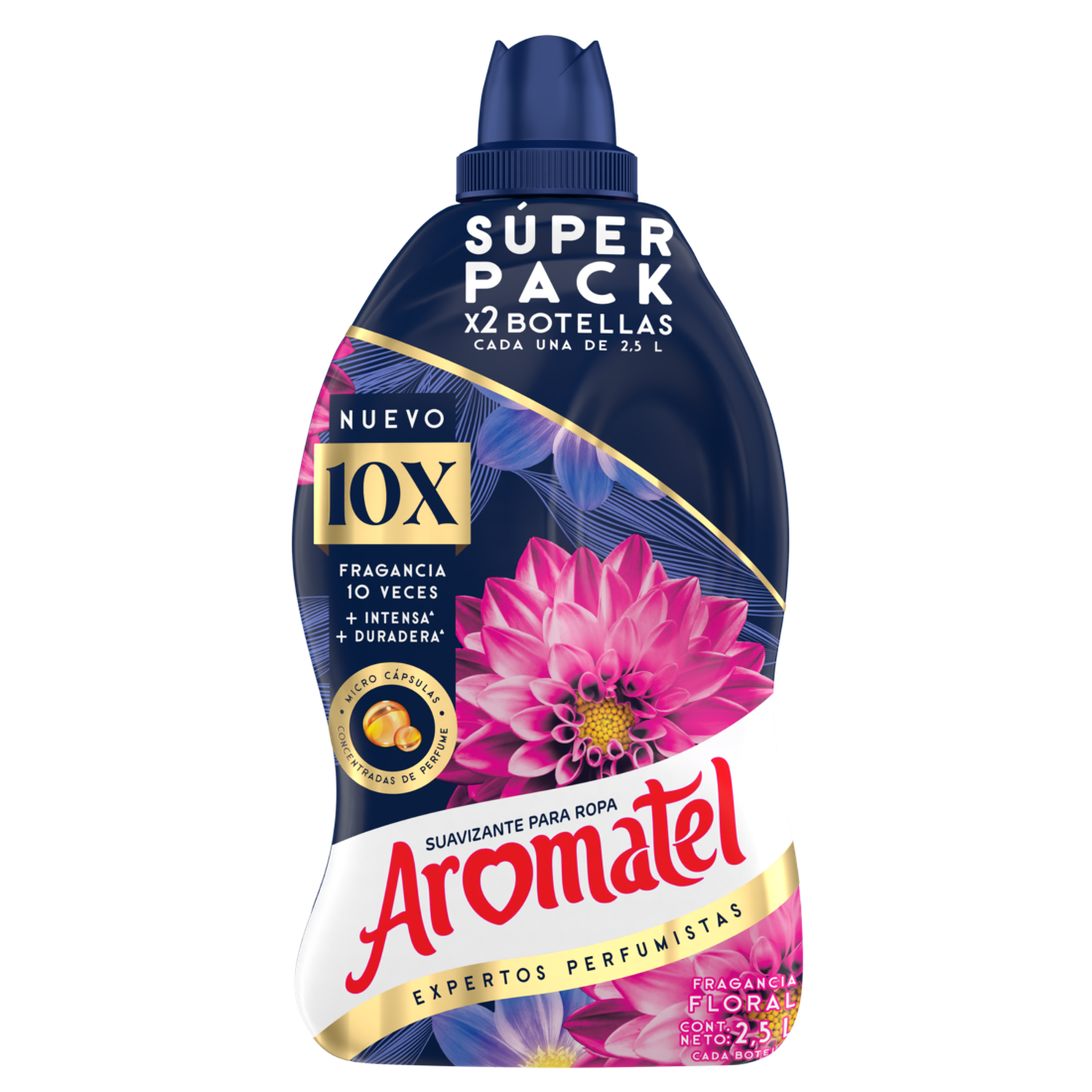 Descubre la deliciosa fragancia del nuevo Aromatel 10X Floral 2×2,5L. El nuevo Aromatel 10X con una fragancia 10 veces más intensa y 10 veces más duradera contiene microcápsulas de perfume concentradas las cuales se impregnan en tus prendas para que el aroma dure por mucho más tiempo. Además, su fórmula avanzada encapsula los malos olores, dejando tus prendas con un fresco aroma floral. El nuevo Aromatel 10X floral no solo se encarga de la fragancia de tus prendas, sino también de su cuidado. Está formulado para suavizar los tejidos, haciendo que tus prendas queden aún más suaves al tacto. Ideal para todo tipo de prendas, este suavizante se adapta a diferentes estilos de vida y necesidades, brindándote una experiencia sensorial única. Con Aromatel, tu ropa no solo quedará suave y fragante, sino que también estará libre de malos olores. Agita bien el envase antes de usar. Usa la tapa medidora para añadir Aromatel durante el ciclo de enjuague de tu lavadora. Deja que la lavadora complete su ciclo como de costumbre. Además, el Suavizante Aromatel Fragancia Floral Botella es muy práctico y económico gracias a su presentación doble de 2,5L, que te permite disfrutar de su exquisita fragancia por mucho más tiempo. Su formato en botella con tapa medidora facilita su uso, asegurando la cantidad correcta de producto para cada lavado. Experimenta la diferencia con Aromatel y da a tus prendas el cuidado que se merecen.