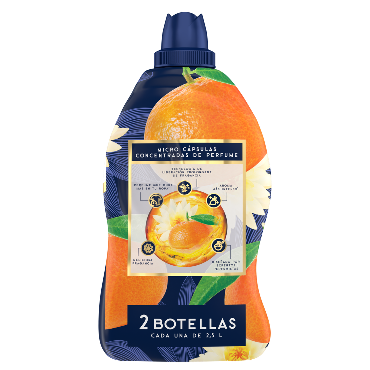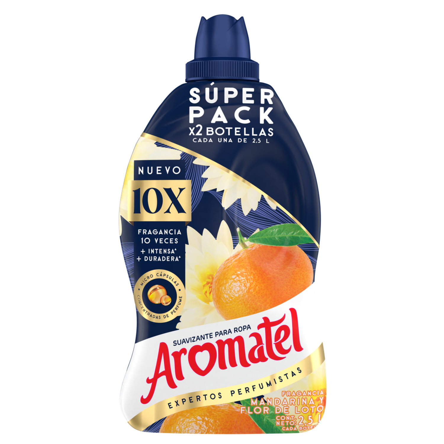 Descubre la deliciosa fragancia del nuevo Aromatel 10X Mandarina 2×2,5L. El nuevo Aromatel 10X con una fragancia 10 veces más intensa y 10 veces más duradera contiene microcápsulas de perfume concentradas las cuales se impregnan en tus prendas para que el aroma dure por mucho más tiempo. Además, su fórmula avanzada encapsula los malos olores, dejando tus prendas con un fresco aroma floral. El nuevo Aromatel 10X floral no solo se encarga de la fragancia de tus prendas, sino también de su cuidado. Está formulado para suavizar los tejidos, haciendo que tus prendas queden aún más suaves al tacto. Ideal para todo tipo de prendas, este suavizante se adapta a diferentes estilos de vida y necesidades, brindándote una experiencia sensorial única. Con Aromatel, tu ropa no solo quedará suave y fragante, sino que también estará libre de malos olores. Agita bien el envase antes de usar. Usa la tapa medidora para añadir Aromatel durante el ciclo de enjuague de tu lavadora. Deja que la lavadora complete su ciclo como de costumbre. Además, el Suavizante Aromatel Fragancia Floral Botella es muy práctico y económico gracias a su presentación doble de 2,5L, que te permite disfrutar de su exquisita fragancia por mucho más tiempo. Su formato en botella con tapa medidora facilita su uso, asegurando la cantidad correcta de producto para cada lavado. Experimenta la diferencia con Aromatel y da a tus prendas el cuidado que se merecen.