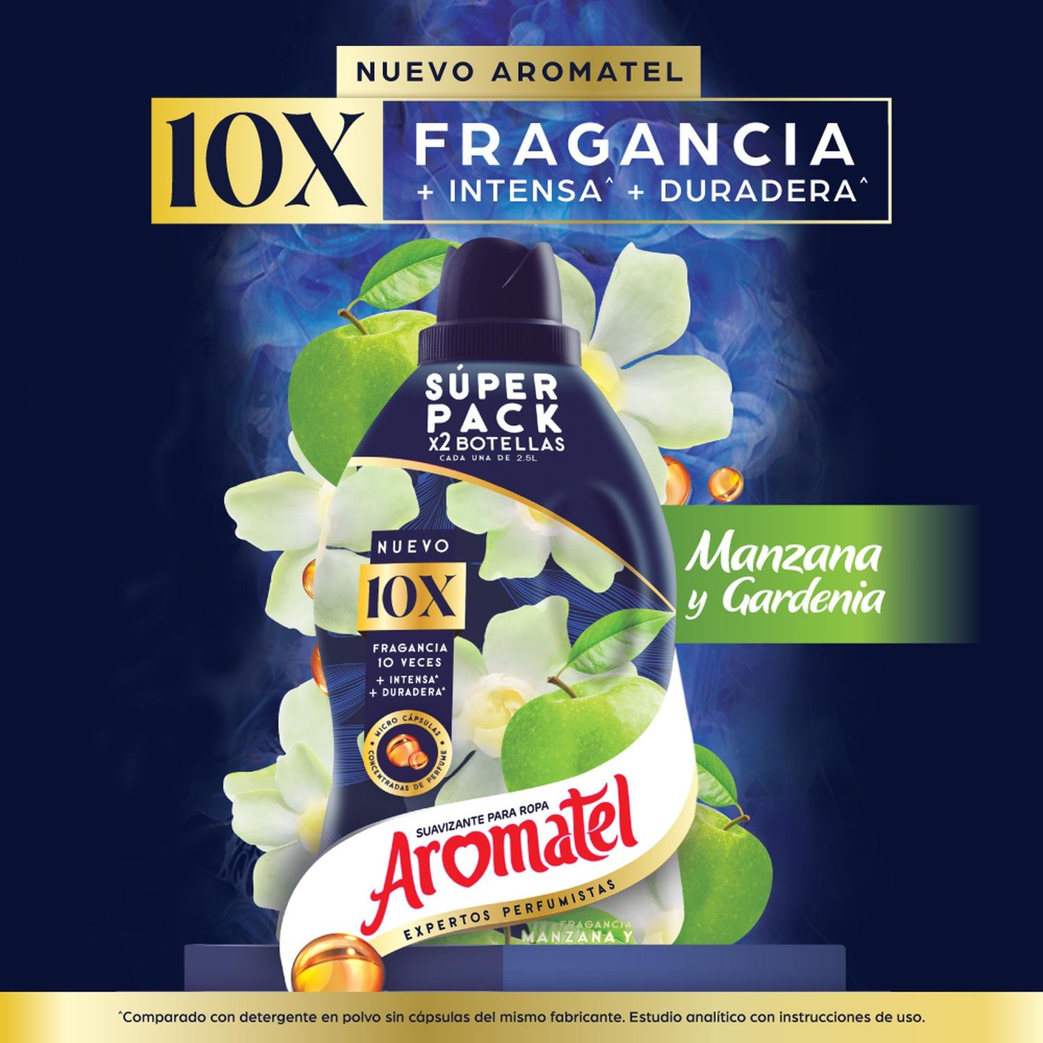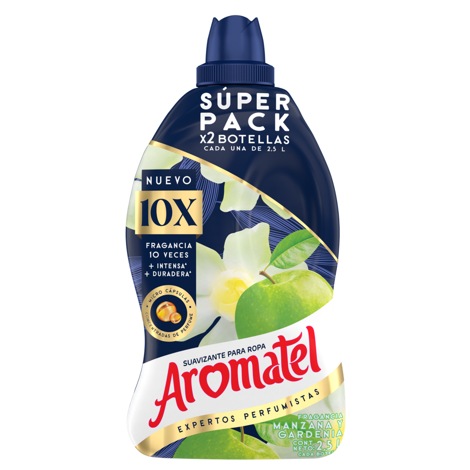 Descubre la deliciosa fragancia del nuevo Aromatel 10X Manzana 2×2,5L. El nuevo Aromatel 10X con una fragancia 10 veces más intensa y 10 veces más duradera contiene microcápsulas de perfume concentradas las cuales se impregnan en tus prendas para que el aroma dure por mucho más tiempo. Además, su fórmula avanzada encapsula los malos olores, dejando tus prendas con un fresco aroma floral. El nuevo Aromatel 10X floral no solo se encarga de la fragancia de tus prendas, sino también de su cuidado. Está formulado para suavizar los tejidos, haciendo que tus prendas queden aún más suaves al tacto. Ideal para todo tipo de prendas, este suavizante se adapta a diferentes estilos de vida y necesidades, brindándote una experiencia sensorial única. Con Aromatel, tu ropa no solo quedará suave y fragante, sino que también estará libre de malos olores. Agita bien el envase antes de usar. Usa la tapa medidora para añadir Aromatel durante el ciclo de enjuague de tu lavadora. Deja que la lavadora complete su ciclo como de costumbre. Además, el Suavizante Aromatel Fragancia Floral Botella es muy práctico y económico gracias a su presentación doble de 2,5L, que te permite disfrutar de su exquisita fragancia por mucho más tiempo. Su formato en botella con tapa medidora facilita su uso, asegurando la cantidad correcta de producto para cada lavado. Experimenta la diferencia con Aromatel y da a tus prendas el cuidado que se merecen.